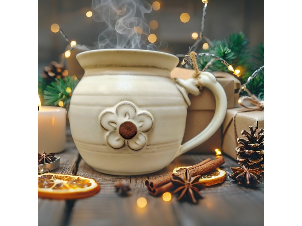 Přírodní vzhled a jemné dekory – kytička a teplé tóny hrnku tvoří útulnou, hřejivou atmosféru.