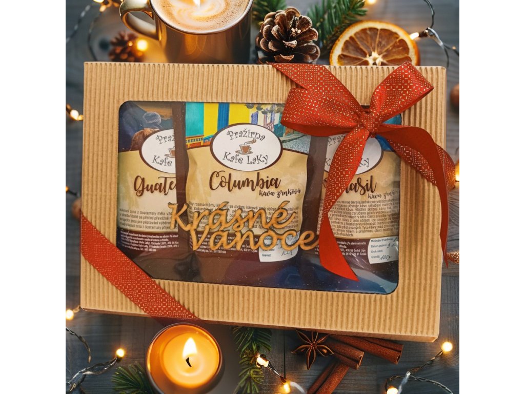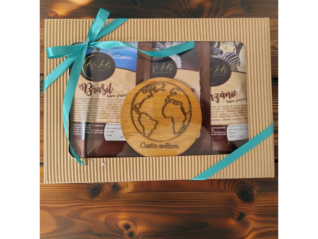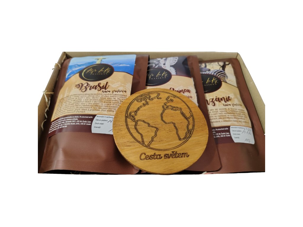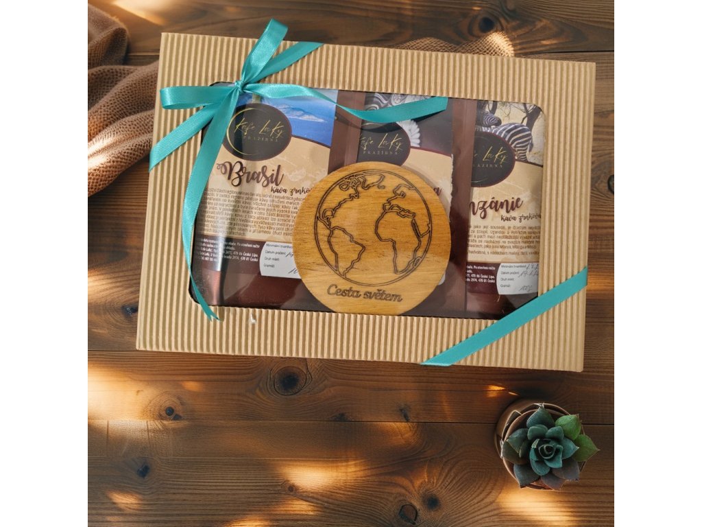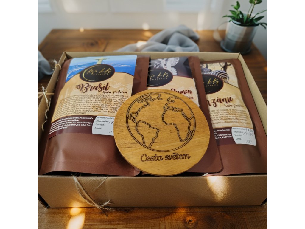 Tři kávy jsou pečlivě uložené v kraftové dárkové kazetě s dřevitou výplní.